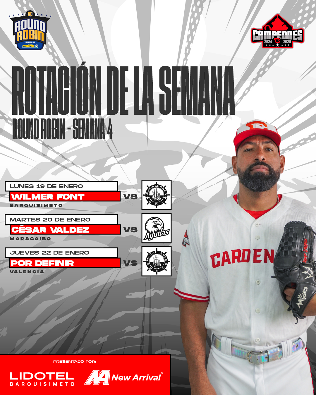 La novena de los Cardenales de Lara (3-3) logró conseguir su tercera victoria de la campaña, iniciando así la semana con buen pie, al vencer a los Navegantes del Magallanes (1-4) por marcador final de 6 carreras por 2, en duelo realizado en el José Bernardo Pérez de Valencia. La victoria fue para el zurdo Edwin Escobar (1-0) y la derrota recayó sobre Junior Guerra (0-1). El más destacado a lo ofensiva por los crepusculares resultó ser Damiano Palmigiani quien se fue de 5-3 con 2 impulsadas.